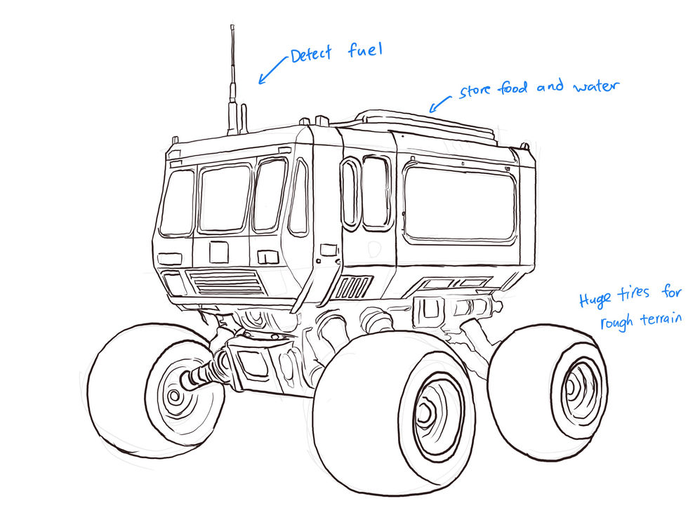 A ground vehicle that uses natural resources found in the ground as a means of locomotion for exploration & scavenging on the surface of an Earth-like desert with sand, rocky mountainous structures, very little plant life. In this world, just below the surface of the planet there is magic flowing in organic "veins" similar to mineral deposits on Earth. This is what is excavated to the fuel for the vehicle as well as other things like building/repairing.